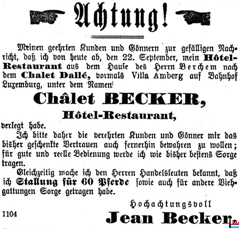 | 14.5.1893 | Versteigerung durch die Erben des zu Luxemburg verlebten Notars Jean Reuter, u.a.: Ein Bauterrain mit den in Fachwerk darauf errichteten Gebäulichkeiten, gelegen nächst dem Central-Bahnhof Luxemburg, genannt „Chalet Dallée", jetzt „Hotel Becker", zwischen Herrn X. de St. Hubert und dem Eisenbahn-Eigentum (Société des tramways ?), stoßend hinten an Herrn Klein und Derulle (früher Jones-Garten) und vorne auf die Staatstraße, Dame Witwe Lamarle-Clesse und unterhalb Letzteren wieder auf die Staatsstraße. In einem einzigen Lose. Größe: 7.260 m2. Jules Reuter, notaire (LW: 1.5.1893) |