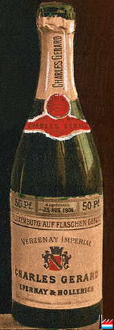 Dem Etikett der Champagnerflasche auf der obigen Neujahrspostkarte zufolge füllte CHARLES GERARD aus Epernay (Champagne / Frankreich) um 1904 in Hollerich (Luxemburg-Bahnhof) Champagner (Verzenay Impérial) ab. Wir haben auch keine weiteren Hinweise auf die Aktivitäten der Champagnerfabrik CHARLES GERARD in Hollerich / Luxemburg gefunden. Das Etikett sieht ziemlich echt aus, oder ist es reine Phantasie?