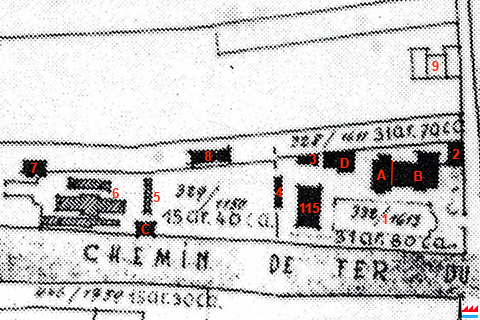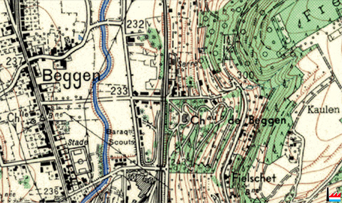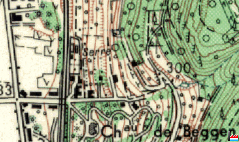 | 1954 | ![]() Au-dessus de la rue Cyprien Merjai: les annexes (e.a. Serre) - en bas de la rue Cyprien Merjai: le Château de Beggen - 1954 © Origine Administration du Cadastre et de la Topographie Luxembourg (ACT) - Extrait de la carte topographique à l'échelle 1: 25.000 édition 1954 - Autorisation de publication du 20.10.2010.» |