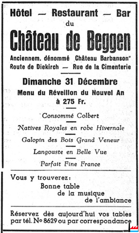 | 1.8.1950 | Beggen - Am 1. August wurde das “ Chäteau de Beggen offiziell eröffnet. Es ist im alten Herrensitz der Familie Barbanson untergebracht und entbehrt deshalb nicht eines feudalen Cachets. Bekanntlich hatte der Belgier Vanderplancke den ganzen Komplex aufgekauft, von dem er vor geraumer Zeit das Schloß an die "S.A. Château de Beggen" weiter veräußerte. Ihm verbleiben also noch die Meierei und ein respektables Areal von Baugelände. Von diesem Gelände ging ein Teil an eine Baugesellschaft über, die dort 34 Häuser errichten will. Von der Terrasse des Schlosses hat man einen herrlichen Ausblick auf eine Parklandschaft mit Springbrunnen. Wer sich für den Miniatur-Golf interessiert, wird ganz bestimmt auf seine Rechnung kommen. Der Golf zählt achtzehn Löcher und der "Schikanen" gibt es genug, um die Bestquote von 46 Punkten zu erreichen. Da der Miniaturgolf gegen eine Gebühr von 15 Fr. auch von Nichthotelgästen benutzt werden darf, tun Sie wohl am besten, mal selber dort vorstellig zu werden um aus dem Munde von Etienne Braun in die Spielregeln eingeweiht zu werden. Jedenfalls ist zur Stunde ganz Jung-Beggen vom Miniatur-Golf begeistert. Die bis jetzt erreichte Bestleistung lautet auf 49 Punkte. Was die Innenausstattung des Hotels anbetrifft, so lieβen Herr Direktor Roland und Frau keine Wünsche offen. Für die internationale Kundschaft stehen zur Zeit 10 Zimmer bereit. Für die Zukunft bestehen allerdings größere Pläne. Die Ausstattung der Gesellschaftsräume, der Eßsaal und der Bar ist gediegen. (t: 8.8.1950) | ||
