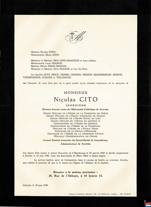 | 1922 | Nicolas Cito, ingénieur, Bruxelles, membre du conseil d'administration de la Banque Belgo-Luxembourgeoise | ||