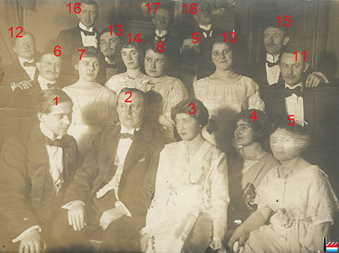 | 1914 ou 1915 | ![]() CLARENS - LAMORT - 1914 / 1915 (?) Fiançailles (?) de Jean-Pierre (Jemmy) Clarens (* 12.11.1885 à Niederwiltz), négociant en gros à Wiltz, fils de Jean Clarens et de Marguerite Even, avec Marguerite (Bout) Lamort (* 13.5.1890 à Luxembourg), fille de Charles-Jacques-Paul Lamort, avocat-avoué, juge de paix à Wiltz, géologue, propriétaire du château de Schuttbourg, et de Félicie Thilges. Le mariage civil fut célébré à Wiltz le 21 avril 1915 par M. Charles Mathieu, bourgmestre de Wiltz. 1. M. Charles Mathieu - 2. M. Jean-Pierre (Jemmy) Clarens - 3. Mme Marguerite (Bout) Lamort - 4. Mme Louise Mathieu - 5. Mme Milla Schmelzer - 6. M. Charles Buffet - 7. Mme Marie-Thérèse Simon - 8. Mme Gertrude (Loulou) Lambert - 9. Mme Gerty Faber - 10. M. Georges Lambert - 11. M. Constant (Cosy) de Muyser - 12. M. Lolo Schmelzer - 13. M. Léon Faber - 14. Mme Mady Lambert - 15. M. Tony Lambert - 16. M. Franzchen Letalle - 17. M. (?) - 18. M. Mich Boever. (Archives privées Guy de Muyser, Luxembourg) |