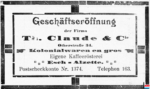 | 1920 | Fondation / Gründung Kaffeerösterei Th. Claude & Cie, 34 Otherstraße, Esch/Alzette Tel. 163 |