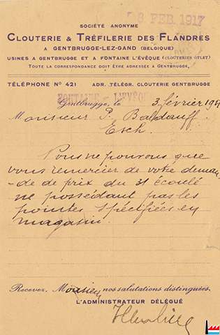 | 2.1917 | ![]() Carte postale du 3.2.1917 de la Clouterie - Tréfilerie des Flandres S.A. à Baldauff Pierre - Eisen und Metalle, Esch/Alzette - Freigegeben von der Überwachungsstelle des VIII Armeekorps, Trier (Collection: industrie.lu) |