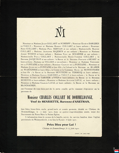 | 31.12.1908 | ![]() Faire-part du décès de Madame Charles Collart de Dommeldange, née Henriette, Baronne d'Anethan, née au Château de La Trapperie, le 6.12.1832, décédée au Château de Dommeldange le 31.12.1908. (Collection: industrie.lu) |