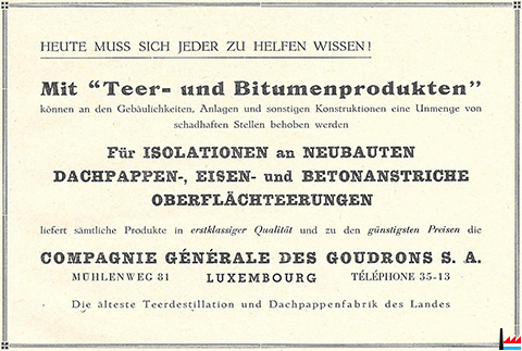 1950 - Compagnie générale des Goudrons S. A. - Mühlenweg 81 - Luxembourg. - Die älteste Teerdestillation und Dachpappenfabrik des Landes. - in Letzebuerger Bauere-Kalenner
