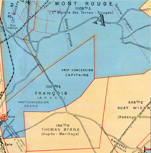 Concession François exploitée par la SMTR en vertu d'un contrat en participation. En 1956, cette concession fut absorbée par la SMTR en échange de titres nouvellement émis. (ARBED 1964) |