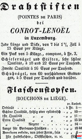 Conrot - Lenoël Drahtstiften Pointes de Paris Flaschenstopfen Bouchons de Liège (LW: 19.8.1860)