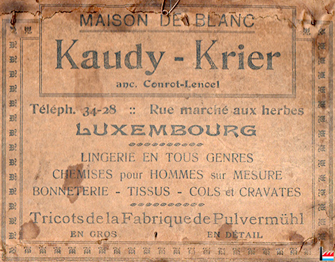 | <=1923 | ![]() Maison Kaudy - Krier anct. Conrot - Lenoël (...) Tricots de Pulvermuhl en gros et en détail (...) - Les Cahiers luxembourgeois - N°II - Novembre 1923. (Collection famille Aschman-Bodson, Luxembourg) |