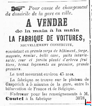 | 8.1870 | Avis: M. Coutel fabricant de voitures à la gare n'a cédé à Personne son établissement, il continue toujours à faire les affaires par lui-même. Il se charge de toutes les réparations de voitures à des prix défiant toute concurrence. Il a toujours au magasin un grand choix de voitures neuves ainsi que des harnais à un et deux chevaux, à des prix très raisonnables. (LADGDDL: 17.8.1870) |