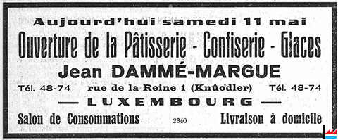 | 11.5.1935 | Pâtisserie - Confiserie Dammé - Margue, Knuôdler, Luxembourg, 1 rue de la Reine, tél: 4874