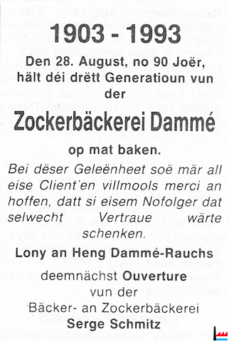 | 15.4.1943 | Déménagement Confiserie Dammé - Margue Jean, Luxembourg, 2 rue de la Reine, place Guillaume |