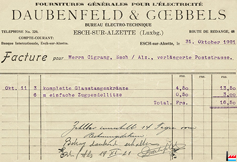 | <=1921 | ![]() Daubenfeld & Goebbels, tél: 320 - Facture du 31.10.1921 (Collection: industrie.lu) 48 rue de Rédange Esch/Alzette Fournitures générales pour l'électricité Bureau électro-technique |