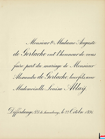 | 1891 | ![]() Mariage Alexandre de Gerlache - Louisa Ablaÿ |
