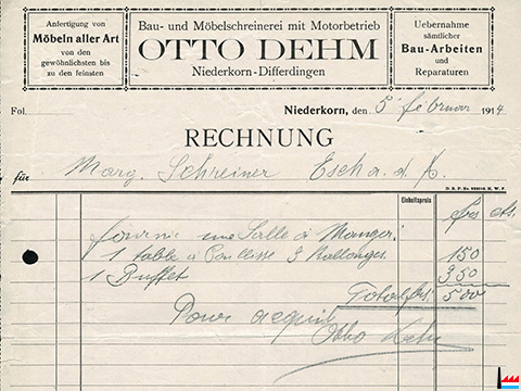 | <=1914 | ![]() Dehm Otto, Niederkorn - Differdingen - Rechnung 5.2.1914 (Collection: industrie.lu) Bau- und Möbelschreinerei mit Motorbetrieb |