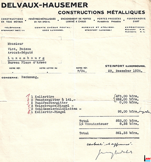 Gebrüder Delvaux, Schlossermeister, Steinfort - Spezialität: Schmiedeeiserne Fenster Stabil (Rechnung: 1911; Collection: industrie.lu)