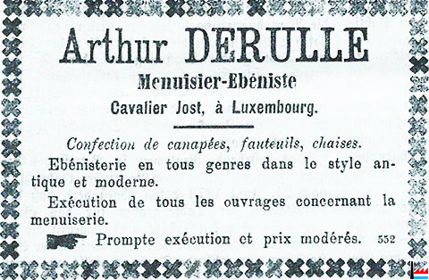| 12.1873 - 12.1874 | ![]() Arthur DERULLE Menuisier-Ebéniste Cavalier Jost, à Luxembourg Confection de canapées, fauteuils, chaises. (LIL: Nombreuses publications entre le 12 décembre 1873 et le 17 décembre 1874) |