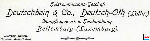 | Holzkommissions-Geschäft Deutschbein & Co, Deutsch-Oth (Lothringen) Audun-le-Tiche (Lorraine) Dampfsägewerk und Holzhandlung Bettemburg (Luxemburg) Telegramm-Adresse: Umbehr, Deutsch-Oth |