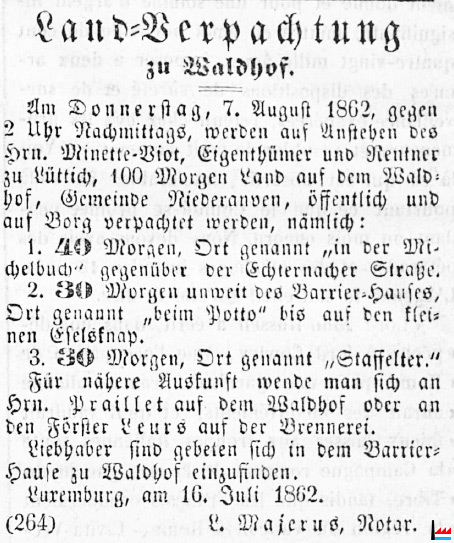 Herr Minette - Biot, Liège, Eigentümer und Rentner zu Lüttich, verpachtet öffentlich und auf Borg 100 Morgen Land auf dem Waldhof