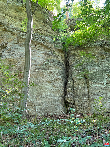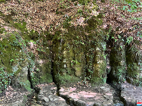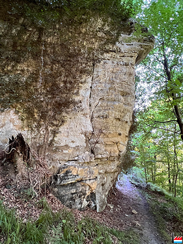 Nun biegen wir nach rechts in den Wald und kommen nach ungefähr 150 m an den langgezogenen „Kauschelterlayen“ vorbei. Dort sehen wir viele Schluchten und tiefe Risse in den steilen Felsen, die wie eine Festung anmuten. Sind wir auf den „Kauschelterlayen“, so haben wir einen schönen Ausblick auf den ansteigenden Wald und einen Teil, von Rollingen, das uns viel aus der alten Zeit zu erzählen weiß.