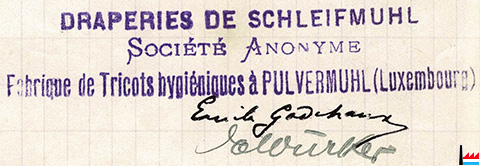 | <=1929 | ![]() Emile Godchaux, Fabrique de Tricots Hygiéniques à Pulvermühl - Draperies de Schleifmuhl S.A. (Extrait d'une facture du 6.5.1929; Collection: industrie.lu) ![]() Signature inconnue |