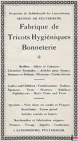 Fabrique de Tricots Hygiéniques Bonneterie - Draperies de Schleifmühl-lez-Luxembourg - Section de Pulvermuhl - 1922 (Publicité -