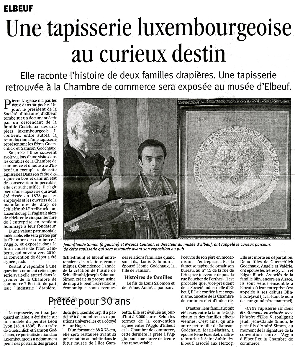 "L'article ci-dessus contient une erreur historique. L'usine de drap en question fut fondée en 1828 par Joseph Salomon Simon, dont le fils Louis Salomon épousa en 1864 une fille de Samson Godchaux. Leur fils André Simon, descendant des Godchaux de Luxembourg (et non "directeur lié par alliance à la famille Godchaux") en fut le dernier propriétaire". Yoel Sher
