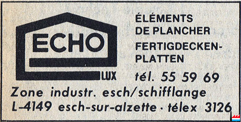 | 8.5.1981 | Inauguration officielle de l'usine ECHOLUX Investissement: plus de 100 Mio. Effectif: 20 Production annuelle visée: 300.000 m² |
