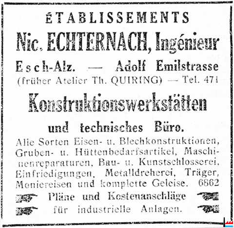 | 1925? | Fondation - Gründung: Nicolas Echternach, ingénieur, Esch/Alzette |