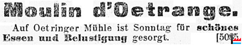 | 11.1926 | ![]() Moulin d'Oetrange - Auf Oetringer Mühle ist Sonntag für schönes Essen und Belustigung gesorgt (LW: 13.11.1926) |
