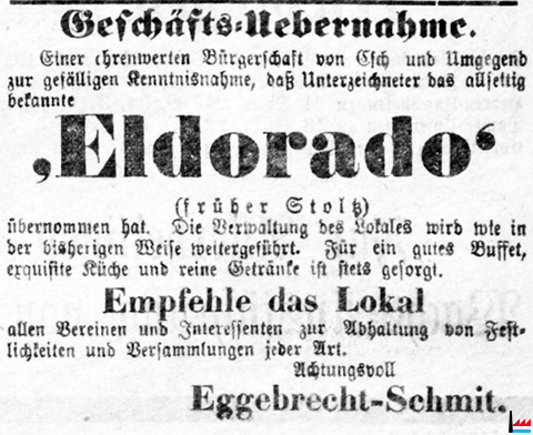 | 11.1908 | Wirtschaftsverlegung: aus dem Eldorado nach der Fleischerstrasse 11 Inhaber: Eggebrecht-Schmit |