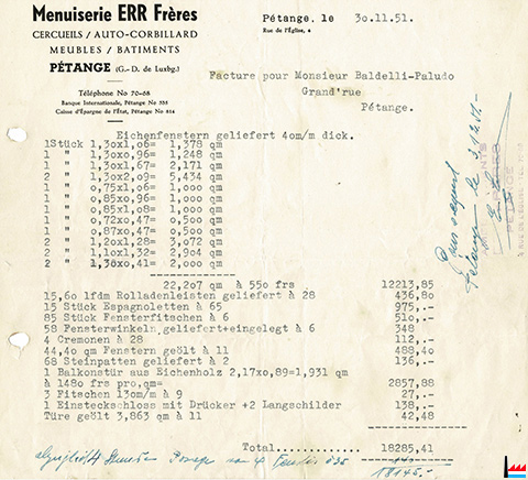| <=11.1951 | ![]() Menuiserie Err frères, 4 rue de l'Eglise, Pétange - facture du 30.11.1951 (Collection industrie.lu) Cercueils, auto-corbillard, meubles, bâtiments |