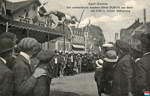 | 1910? | ![]() Esch/Alzette: Der weltberühmte Amateur-Athlet Dubois aus Gent bei 2,95 m hohem Stabsprung (Carte postale: 8631 P. Thorn, Photogr., Esch/Alzette; Collection: industrie.lu) |