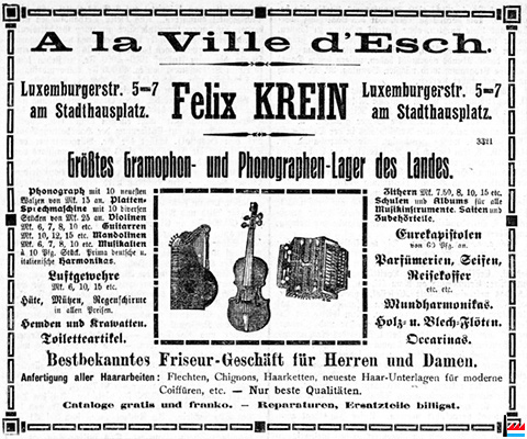 Café Kihm-Sartor (N° 1) - Laiterie centrale Wagener - Kugener (N°3) - Magasin A la Ville d'Esch (5 rue de Luxembourg, Esch/Alzette) - place de l'Hôtel de Ville - rue de Luxembourg - vers 1914 (Carte postale: Collection: industrie.lu)