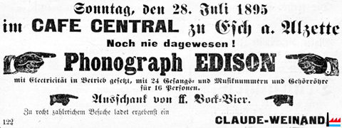 | 28.7.1895 | ![]() Café Central, Esch/Alzette - Phonograph EDISON (Escher Courrier: 27.7.1895) |