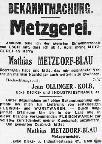 | 15.2.1928 | Eröffnung der Metzgerei Ollinger-Kolb Jean, Esch/Alzette, Ecke Dicks- und Industriestrasse |