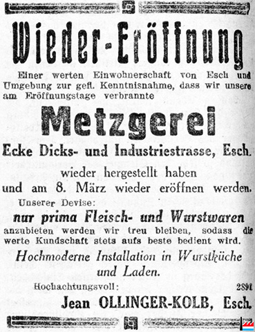 | 8.3.1928 | ![]() Wiedereröffnung der Metzgerei Ollinger-Kolb Jean, Esch/Alzette, Ecke Dicks- und Industriestrasse (t: 7.3.1928) |