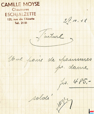 | 1948 | ![]() Chaussures Camille Moyse, Esch/Alzette, 120 rue de l'Alzette, tél: 2181 - facture du 29.10.1948 (Collection: industrie.lu) |