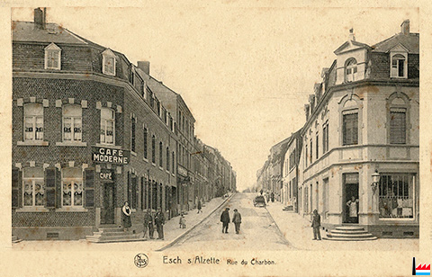 ![]() Esch/Alzette, rue du Canal (anc. rue de Rédange) - A gauche: Café Moderne, Esch/Alzette, coin 1 rue des Charbons - A la droite: Jean Hartert, coin 2 rue des Charbons (Carte postale: Nels - E.A. Schaack, Luxembourg; Collection: industrie.lu) |