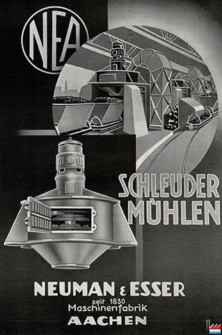 | 1952 | ![]() ![]() ![]() Projekt Farbmahlanlage Z 4126 von Neuman & Esser Maschinenfabrik, Aachen für Eisenerz-, Baustein- und Farbenbergbau Jack Muller, Esch/Alzette - 10.5.1952 (Collection industrie.lu) Pendelmühle P.M. 3 & Schleudermühle 1000-2 (Vorbrecher) Leistung: 125 - 250 kg /h Fein-Mahlanlage - Vorzerkleinerung & Mahltrocknung |