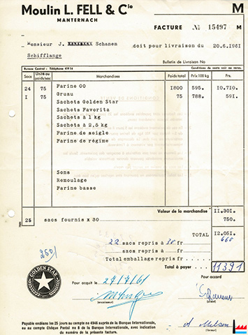 ![]() Moulin L. Fell et Cie, Manternach - Facture à Boulangerie J. Schanen, Schifflange (Collection: Michèle Schanen) ![]() Golden Star |