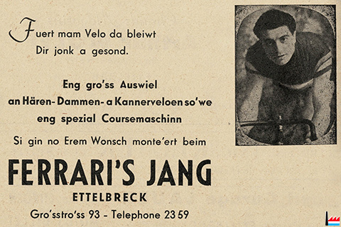 | <=1948 | ![]() Ferrari's Jang, Ettelbreck, Gro'sstro'ss - 1948 (Collection: industrie.lu) Fuert mam Velo da bleiwt Dir jonk a gesond. Ferrari Jean, Ettelbruck, Grand'rue, cycles, articles de sports Tél: 2359 |