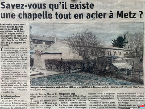 | 1957 | ![]() ![]() Chapelle Sainte-Bernadette, rue du Général Morlot, Woippy, quartier des Quatre-Bornes - construction Fillod: 1957 (Photos: 30.6.2021 jmo) Chapelle Standard Type W Dimensions: 10,246 m x 35,948 m |