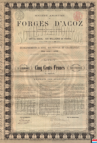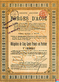 Société Anonyme des Hauts-Fourneaux, fonderies et mines de Musson par la Banque de Belgique (1950 actions) et la Société des Forges d'Acoz (700 actions) Capital social: 1.500.000 francs à 3000 actions Mine à Belvaux et Mine Renkert, Oberkorn |