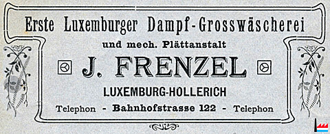 | 1911 | Luxemburger Dampf-Großwäscherei, J. Frenzel, Luxembourg-Hollerich Bahnhofstraße 122 |