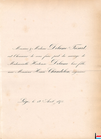 Faire part du mariage d'Hortense Delame, fille de M. et Mme Delame-Frésart, avec Henri Chandelon, ingénieur - Liège, le 19.4.1873 (Collection: industrie.lu)
