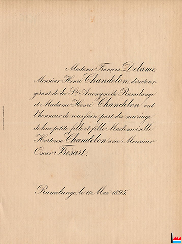 Faire part du mariage d'Hortense Chandelon, fille d'Henri Chandelon, directeur-gérant de la S.A. de Rumelange, avec Oscar Frésart - Rumelange le 11.5.1895 (Eug. Hoffman, Luxembourg; Collection: industrie.lu)