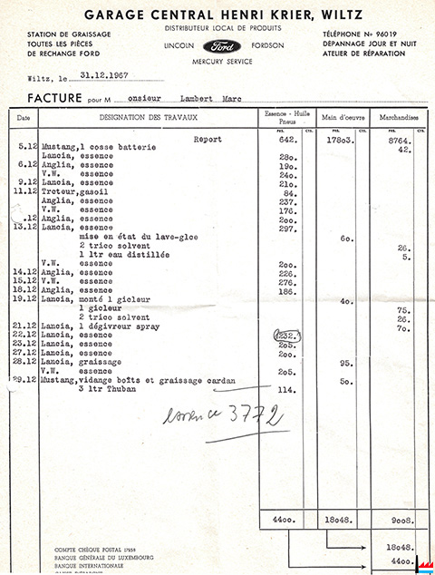 ![]() Facture Garage Central Henri Krier, Wiltz à Marc Lambert - 1967 (Collection: Philippe Aschman) |