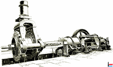 Erster 600 pferdiger Gichtgasmotor erbaut durch die Firma Cockerill für das Differdinger Werk. (Das Bild zeigt den Motor auf der Versuchsbank in Seraing.)
