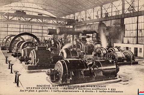Société Métallurgique de Normandie - SMN - Station centrale - Au fond: 3 machines soufflantes à gaz - au 1er plan à gauche: 3 turbo-alternateurs - A droite: 2 turbo-soufflantes (Carte postale: Collection: industrie.lu)